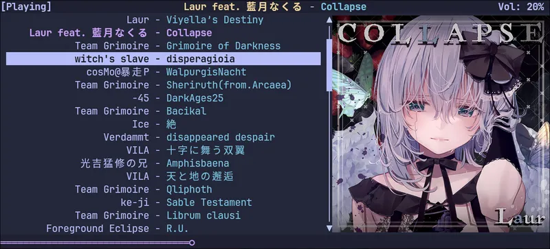 Section titled “Config”#![enable(implicit_some)]#![enable(unwrap_newtypes)]#, layout: Split( direction: Vertical, panes: [ ( pane: Pane(Header), size: "1", ), ( pane: Pane(TabContent), size: "100%", ), ( pane: Pane(ProgressBar), size: "1", ), ], ), progress_bar: ( symbols: ["", "", "⭘", " ", " "], track_style: (bg: "#1e2030"), elapsed_style: (fg: "#c6a0f6", bg: "#1e2030"), thumb_style: (fg: "#c6a0f6", bg: "#1e2030"), ), scrollbar: ( symbols: ["│", "█", "▲", "▼"], track_style: (), ends_style: (), thumb_style: (fg: "#b7bdf8"), ), browser_column_widths: [20, 38, 42], text_color: "#cad3f5", background_color: "#24273a", header_background_color: "#1e2030", modal_background_color: None, modal_backdrop: false, tab_bar: (active_style: (fg: "black", bg: "#c6a0f6", modifiers: "Bold"), inactive_style: ()), borders_style: (fg: "#6e738d"), highlighted_item_style: (fg: "#c6a0f6", modifiers: "Bold"), current_item_style: (fg: "black", bg: "#b7bdf8", modifiers: "Bold"), highlight_border_style: (fg: "#b7bdf8"), song_table_format: [ ( prop: (kind: Property(Artist), style: (fg: "#b7bdf8"), default: (kind: Text("Unknown"))), width: "50%", alignment: Right, ), ( prop: (kind: Text("-"), style: (fg: "#b7bdf8"), default: (kind: Text("Unknown"))), width: "1", alignment: Center, ), ( prop: (kind: Property(Title), style: (fg: "#7dc4e4"), default: (kind: Text("Unknown"))), width: "50%", ), ], header: ( rows: [ ( left: [ (kind: Text("["), style: (fg: "#b7bdf8", modifiers: "Bold")), (kind: Property(Status(State)), style: (fg: "#b7bdf8", modifiers: "Bold")), (kind: Text("]"), style: (fg: "#b7bdf8", modifiers: "Bold")) ], center: [ (kind: Property(Song(Artist)), style: (fg: "#eed49f", modifiers: "Bold"), default: (kind: Text("Unknown"), style: (fg: "#eed49f", modifiers: "Bold")) ), (kind: Text(" - ")), (kind: Property(Song(Title)), style: (fg: "#7dc4e4", modifiers: "Bold"), default: (kind: Text("No Song"), style: (fg: "#7dc4e4", modifiers: "Bold")) ) ], right: [ (kind: Text("Vol: "), style: (fg: "#b7bdf8", modifiers: "Bold")), (kind: Property(Status(Volume)), style: (fg: "#b7bdf8", modifiers: "Bold")), (kind: Text("% "), style: (fg: "#b7bdf8", modifiers: "Bold")) ] ) ], ),)You also need to put the following tabs config into your config.ron to get the album art on the right.