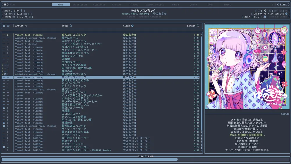 ]) ), (name: "Directories", pane: Split(direction: Horizontal,panes: [ (size: "100%", borders: "ALL", border_symbols: Rounded, pane: Pane(Directories)), ]) ), (name: "Playlists", pane: Split(direction: Horizontal, panes: [ (size: "100%", borders: "ALL", border_symbols: Rounded, pane: Pane(Playlists)), ]) ), (name: "Artists", pane: Split(direction: Horizontal, panes: [ (size: "100%", borders: "ALL", border_symbols: Rounded, pane: Pane(Artists)), ]) ), (name: "Albums", pane: Split(direction: Horizontal, panes: [ (size: "100%", borders: "ALL", border_symbols: Rounded, pane: Pane(Albums)), ]) ), (name: "Album Artists", pane: Split(direction: Horizontal, panes: [ (size: "100%", borders: "ALL", border_symbols: Rounded, pane: Pane(AlbumArtists)), ]) ), (name: "Genre", pane: Split(direction: Horizontal, panes: [ (size: "100%", borders: "ALL", border_symbols: Rounded, pane: Pane(Browser(root_tag: "genre", separator: ";"))), ]) ), (name: "Queue", pane: Split(direction: Vertical, panes: [ (size: "2", borders: "TOP | RIGHT | LEFT", border_symbols: Rounded , pane: Pane(QueueHeader())), (size: "100%", borders: "ALL", border_symbols: Library("rounded_collapsed_top"), border_title: [(kind: Property(Song(File)), style: (fg: "#4c566a"))], border_title_position: Bottom, border_title_alignment: Right, pane: Pane(Queue)), ])